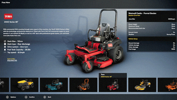 Execute ground checks, set your blade height, and measure your engine load as you complete a variety of contracts across Career Mode, Free Mode or Challenge Mode. Take your mowing further with several attachments from stripe rollers, mulching kits, grass collectors, recyclers, flail decks and more.