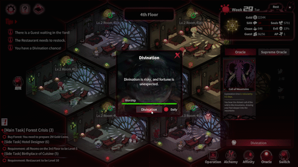 In this game, you inherit an ancient villa burdened with shadowy debts. You’ll manage a hotel and hire diverse staff members including Death, a dragon, a Spirit Hunter, and a bioroid maid. Enigmatic guests will arrive, each bringing their own mysterious events. Build your wealth through various methods like mining, adventuring, alchemy, and restaurant management, while adjusting your strategies based on the predictions of Oracles.